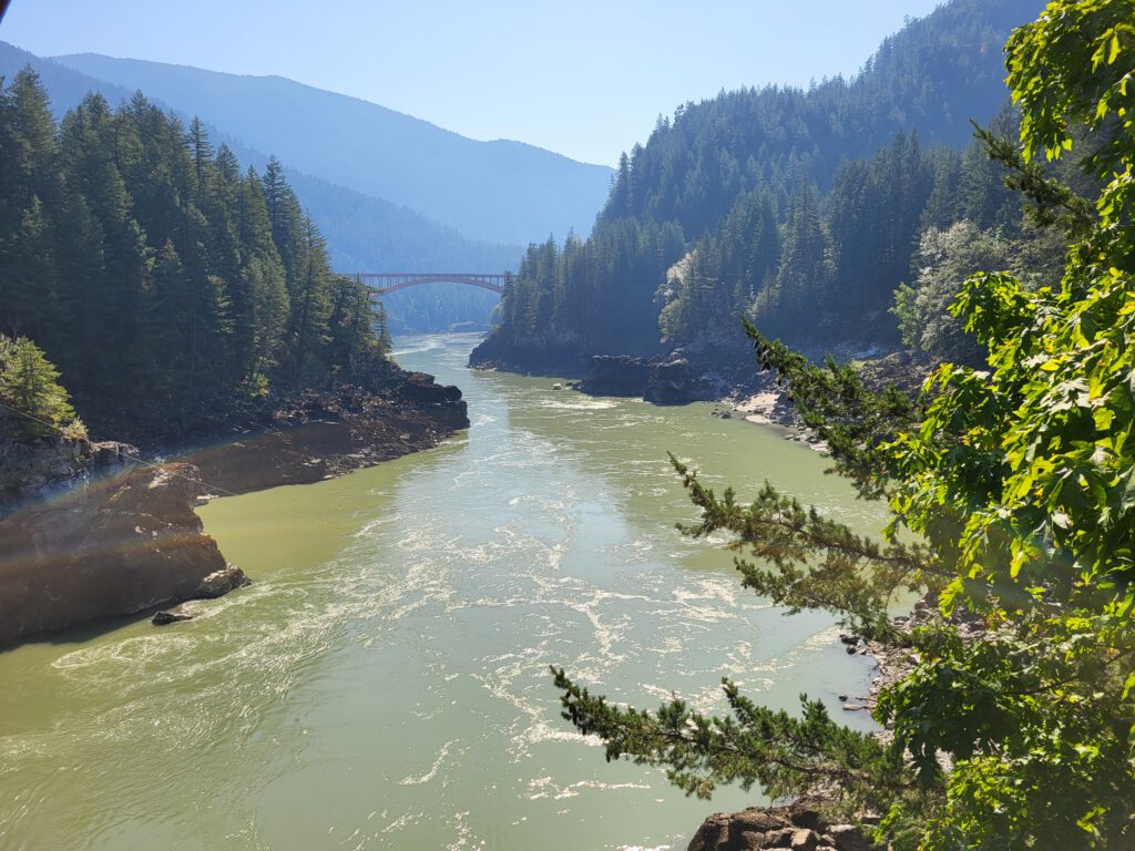 Om 8:00 uur vertrekken wij richting Yale via Highway 1. We zitten al gauw in de bergen. Wat is het mooi hier. We willen graag de Lady Franklin Rock bezichtigen, helaas hebben wij die niet kunnen vinden. Wel vonden we een mooie plek bij de Fraser River. Het is er ontzettend mooi. We gaan weer naar Highway 1. Nu op weg naar de Alexandra Bridge. Deze rijden wij ongemerkt voorbij. Dat vinden wij niet zo fijn. Enfin de volgende stop is de Hell’s Gate Airtram. In rode gondola’s van de kabelbaan worden we over de rivier gebracht. Hier ontmoeten we onze landgenoten. Het is een mooie belevenis. Onder ons stroomt de mooie Fraser River. Dit is ook de smalste kloof van de rivier namelijk 33 meter. We lopen over de hangbrug. Dat is ontzettend gaaf. A bruncht hier want ze heeft niet ontbeten. Op de terugweg zien we zalmen die tegen de richting in zwemmen om eitjes te leggen. Dat is hun laatste reis. Hierna gaan zij dood. Erg goed voor de beren, die eten ze weer op voordat ze hun winterslaap gaan houden. Wij hebben ze nog niet gezien. In het restaurant vragen we naar de Alexandra Bridge. We hebben deze echt over het hoofd gezien. We rijden terug. Het is even zoeken naar het wandelpad naar de brug. Het zou 10 min lopen zijn. Het is toch spannend. We zijn de enige personen die in het bos zijn. Volgens het bordje, dat wij vlak voor de spoorwegovergang zien, mogen we niet verder. No Trespassing staat erop. Wij volgen dit altijd op. Nu even niet. We steken de spoorweg over en na een korte wandeling komen we bij de brug. Wat is die mooi. Hiervandaan zie je de nieuwe brug. We zijn alleen. Maar wel ontzettend gaaf. Als we terug lopen komen we wel meer personen tegen. Phew wij zijn dus niet de enigen die zo een waarschuwing negeren. Gaaf dat we het gezien hebben.