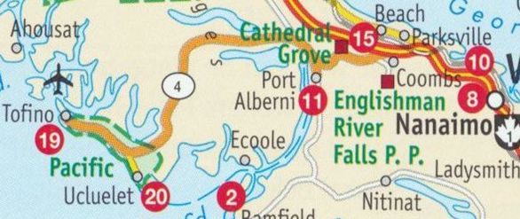 Het is ondertussen 15:00 uur. We moeten nog 125 km rijden. We hadden nog een paar uitstapjes maar door de regen slaan we die over. De weg naar Tofino is mooi maar best pittig door vele regen en haarscherpe bochten.