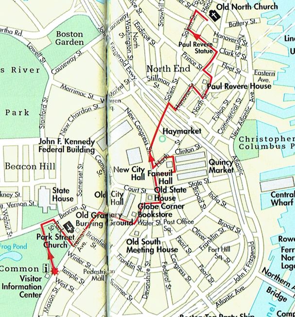Om 10:00 brengt de shuttlebus van het hotel ons naar de T – Red Line bij station JFK. Met een dagticket op zak, dat $11 kost, reizen we naar het centrum. In het Visitor Center kopen we een gids van de Freedom Trail. Dit is een route, gemarkeerd met rode straatstenen, die langs verschillende gebouwen voert die iets met vrijheid en de geschiedenis van Boston te maken hebben.