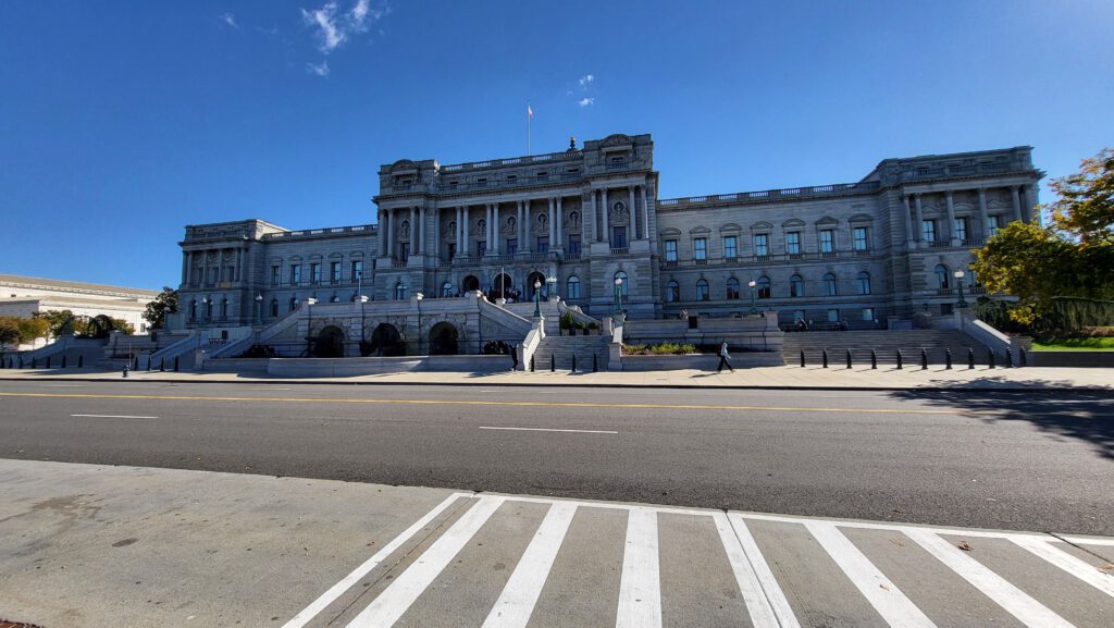 Onze eerste stop is de Library of Congress. Het is rustig, slechts één vrouw staat buiten met een protestbord. Daarna lopen we naar het Supreme Court, dat daar vlakbij ligt. Helaas staat het gebouw in de steigers vanwege renovaties. Beide gebouwen zijn gesloten voor het publiek.